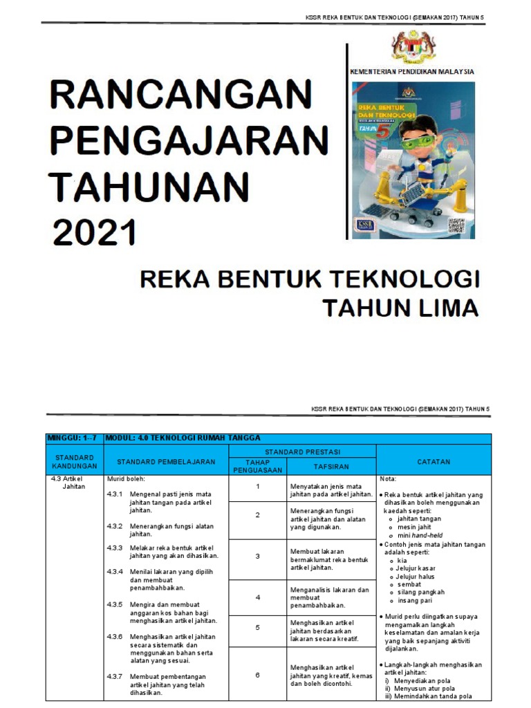 RPT Rancangan Pengajaran Tahunan mengandungi secara ringkas isi pengajaran dan pembelajaran berdasarkan Dokumen Standard Kurikulum dan Pentaksiran DSKP yang dikeluarkan oleh Bahagian Pembangunan Kurikulum Kementerian Pendidikan Malaysia. Kit Program Transisi Tahun 1 20 Sesi 2022. PEMETAAN STANDARD KURIKULUM DAN PENTAKSIRAN DSKP REKA BENTUK DAN TEKNOLOGI RBTTAHUN 4.